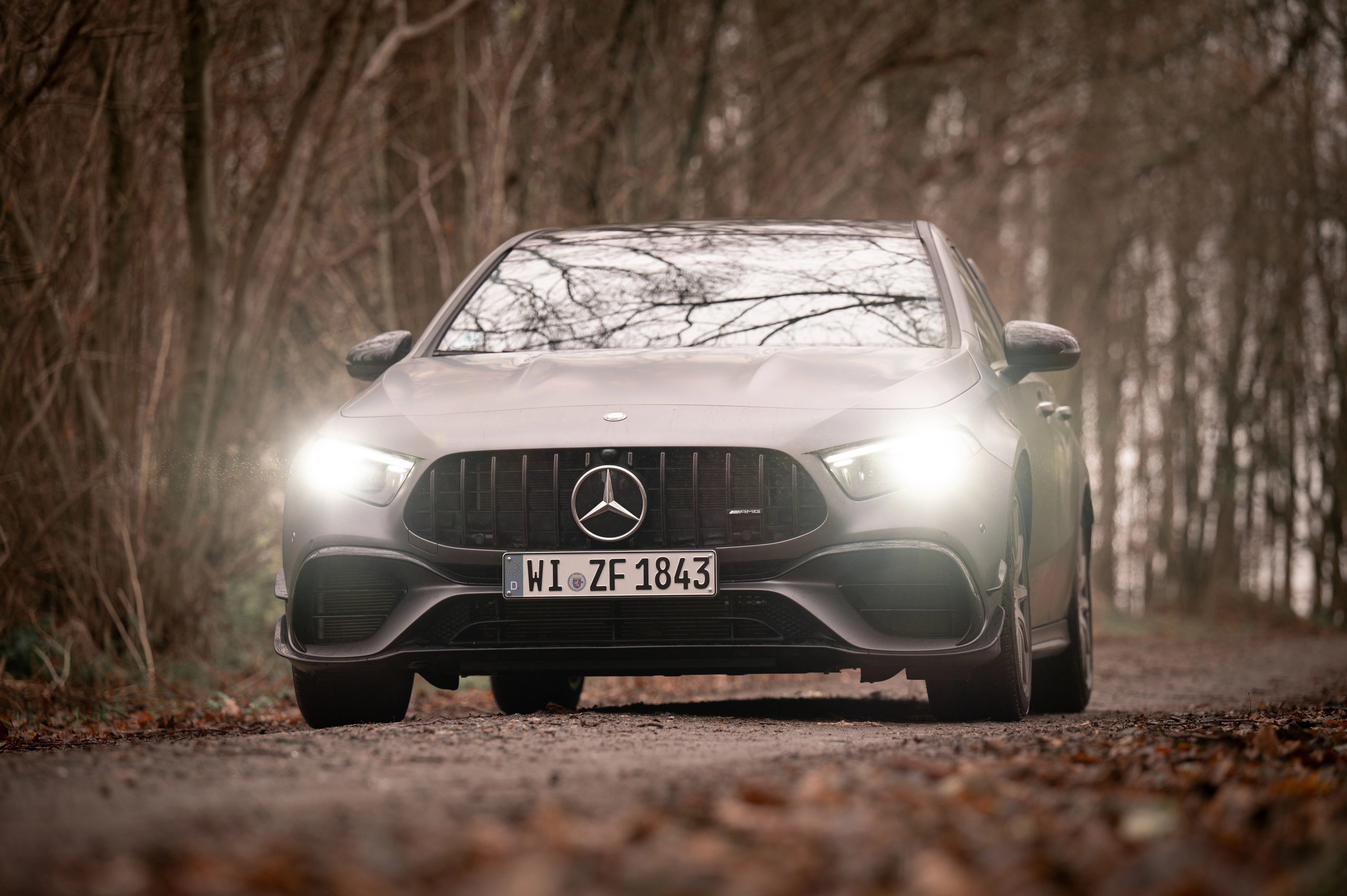 Kompakter Hochleistungs-PKW von Mercedes-AMG — dramatische Außenaufnahme, Location mit Charakter.